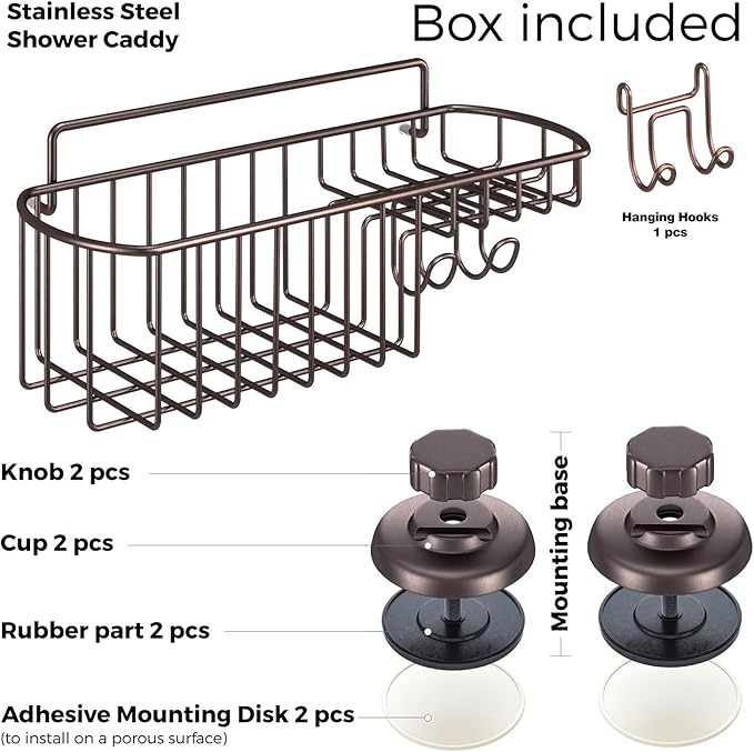 Accesorios HASKO - Cesta de ducha con potente ventosa para champú - Cesta organizadora combinada con jabonera y ganchos - Soporte de acero inoxidable para almacenamiento en el baño (bronce)