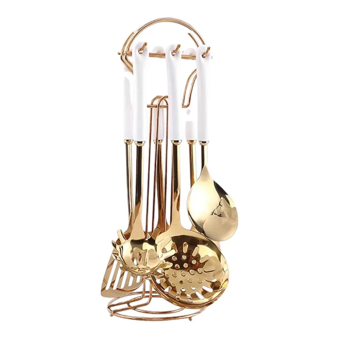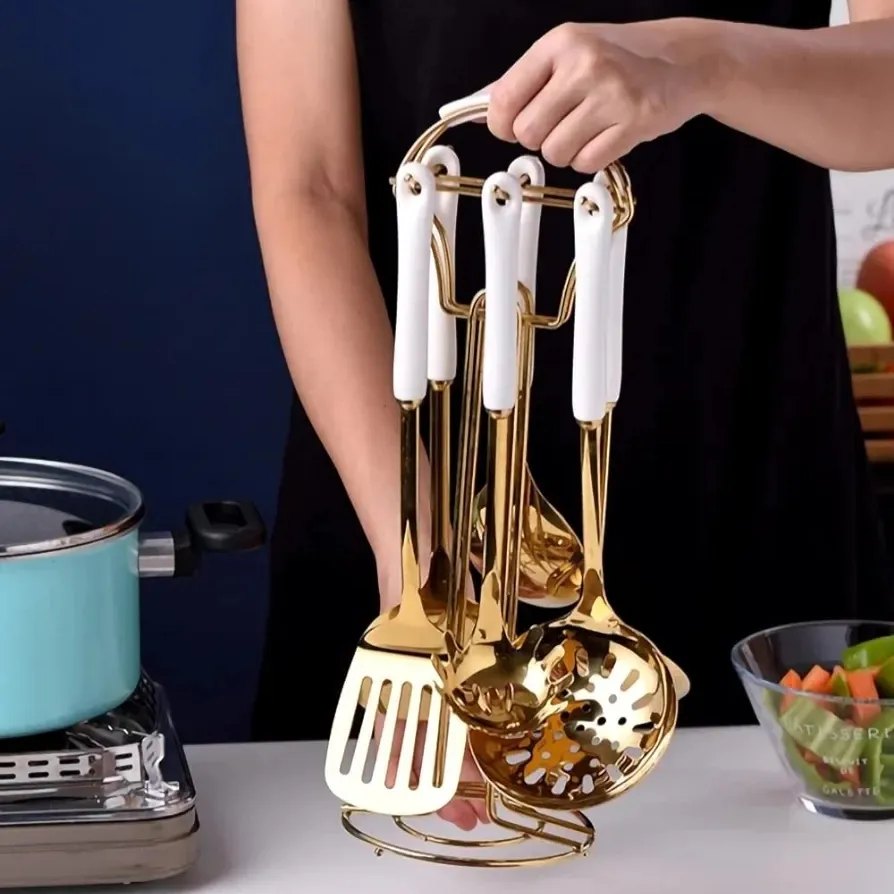 AQUAX Juego de utensilios de cocina de acero inoxidable de siete piezas (oro blanco). Utensilios de cocina 7 piezas con estante colgante. Incluye cuchara grande ranurada, cucharón de sopa, espátula.