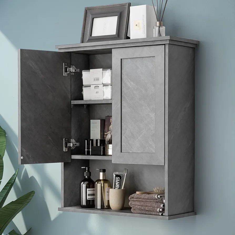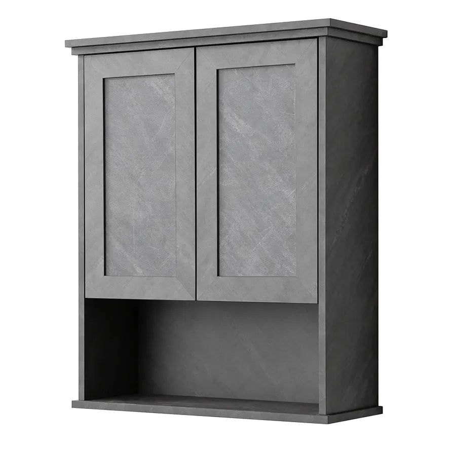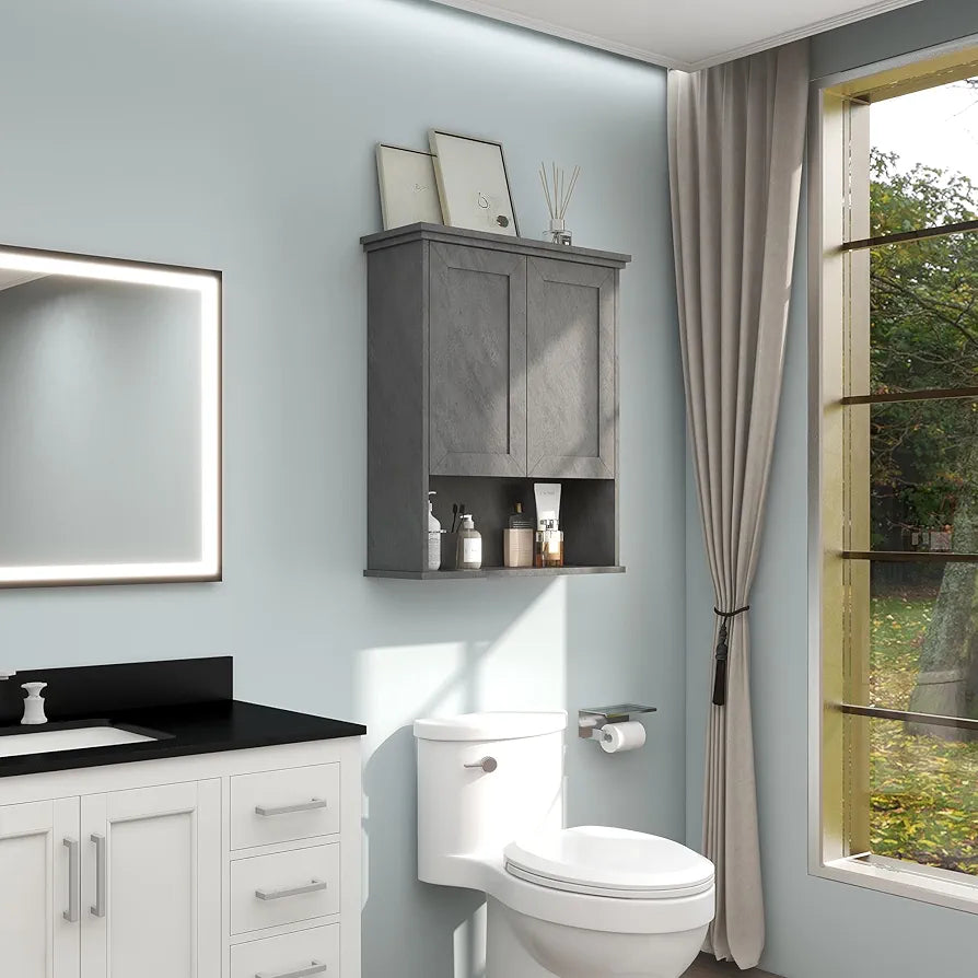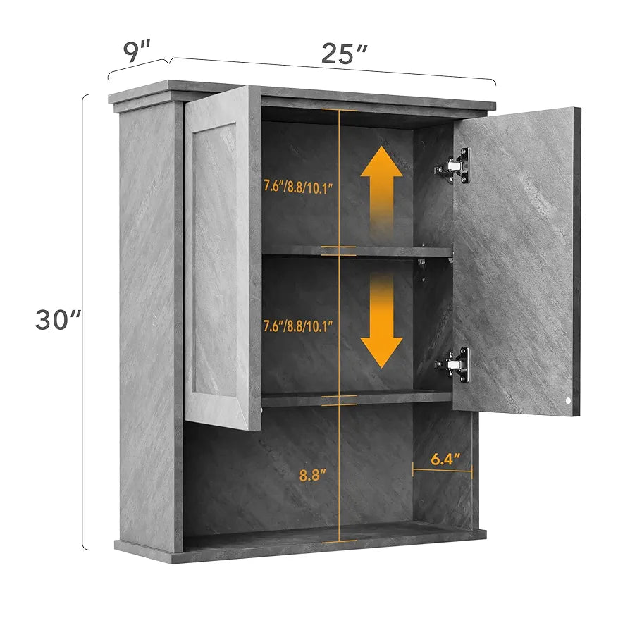 Armario de pared de baño sobre inodoro de 25 x 30 pulgadas, gabinetes de madera para medicamentos para baño, armario montado en la pared con 2 puertas y estante ajustable, textura gris