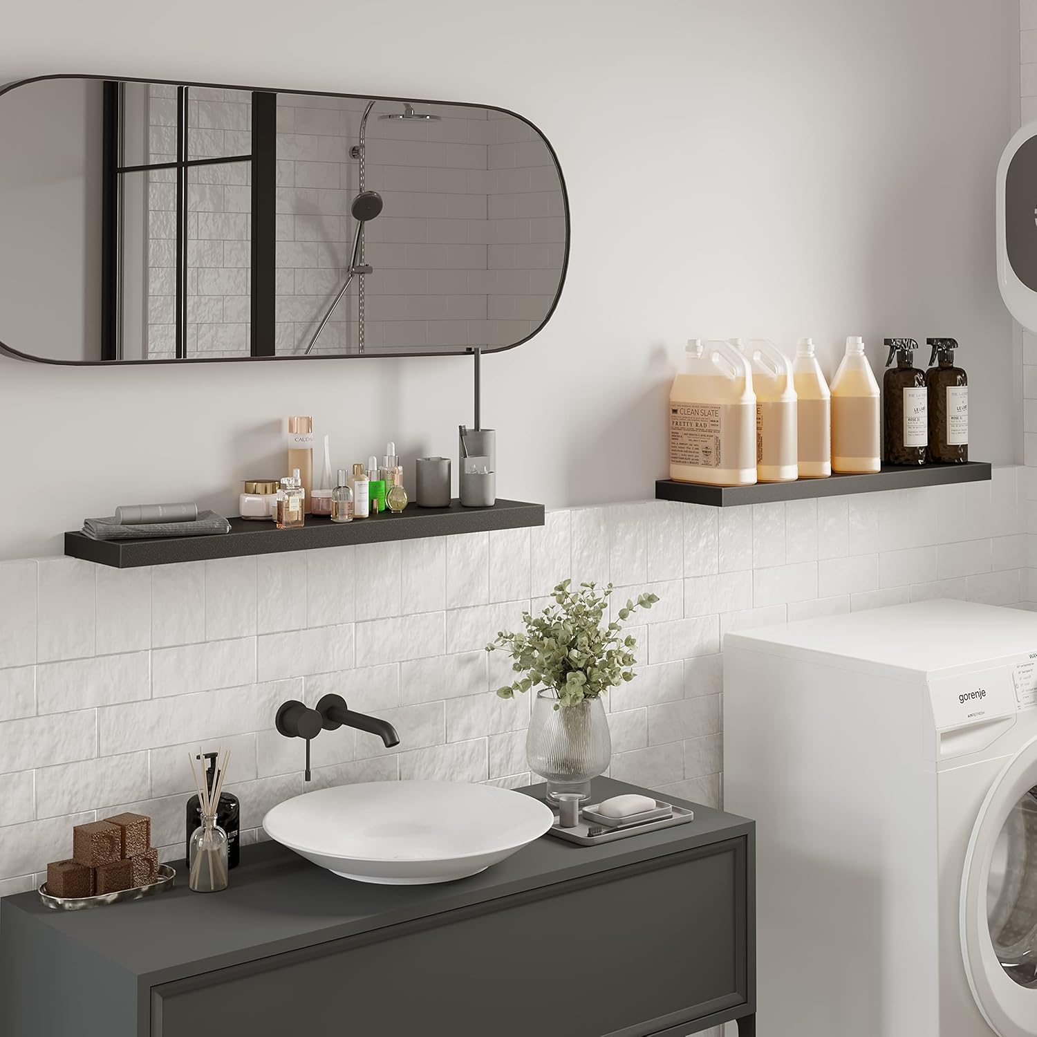 BAMEOS - Estantes flotantes de madera color negro, 31.5 x 7.7 pulgadas (AxP) con soportes invisibles, juego de 2, estantes colgantes de pared para dormitorio, baño, sala de estar y cocina