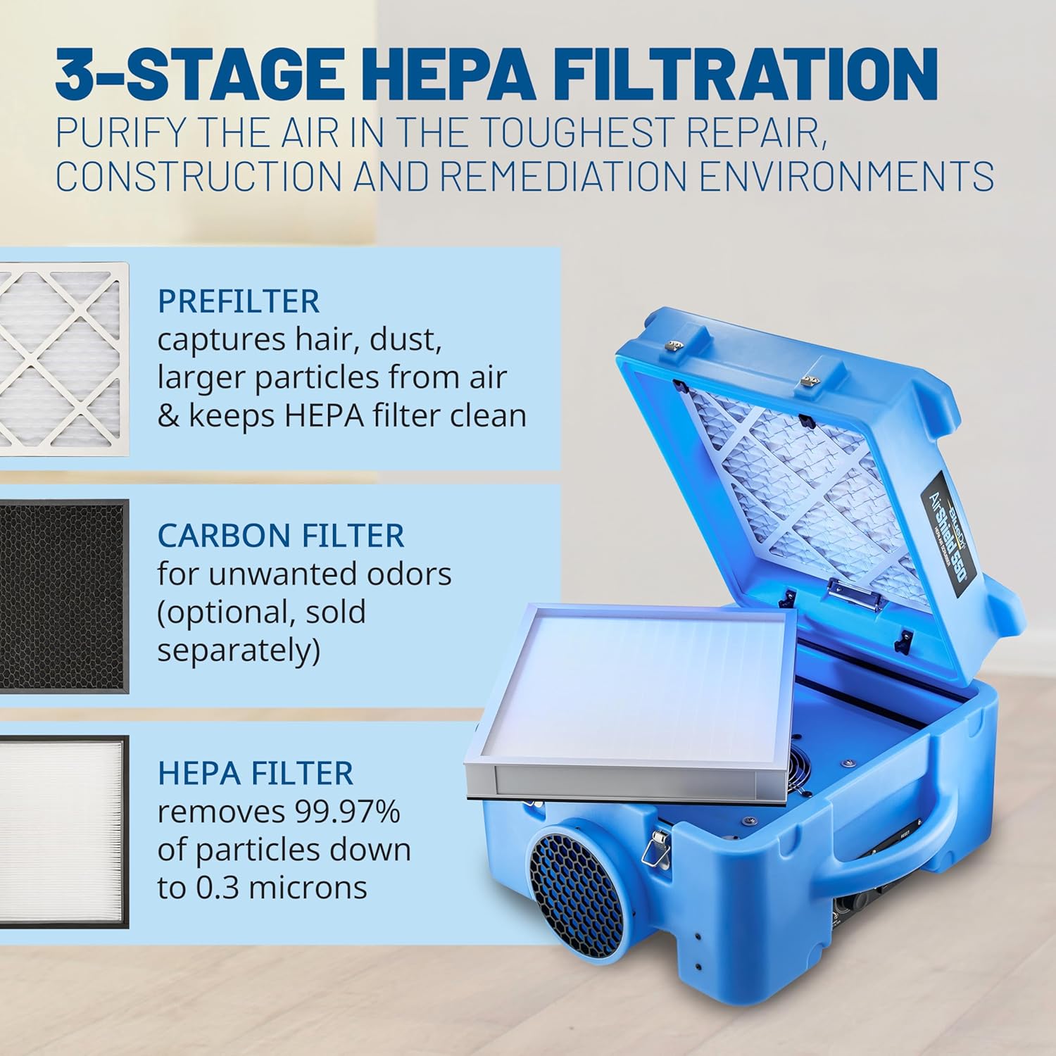 - SERVICIO PESADO - AS-550 funciona en 3 etapas diferentes, cada una de las cuales ofrece su propia contribución única a la purificación del aire. El prefiltro protege el filtro HEPA principal, actuando como un limpiador de partículas grandes, lo que permite que el filtro HEPA haga el trabajo más fino. Ideal para sitios de reparación y construcción comerciales y remediación de aguas residuales, restauración de daños por agua e incendio.