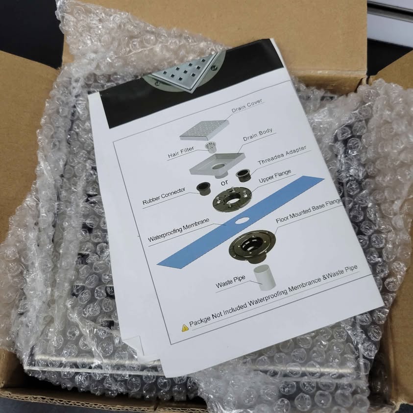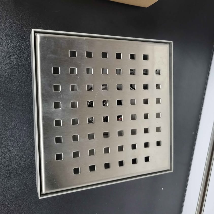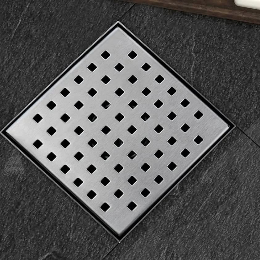 Desagüe cuadrado de alto flujo de 6 pulgadas con brida, con rejilla extraíble de patrón cuadrato y filtro de pelo de doble capa, acero inoxidable SUS 304, certificado Watermark y CUPC, níquel