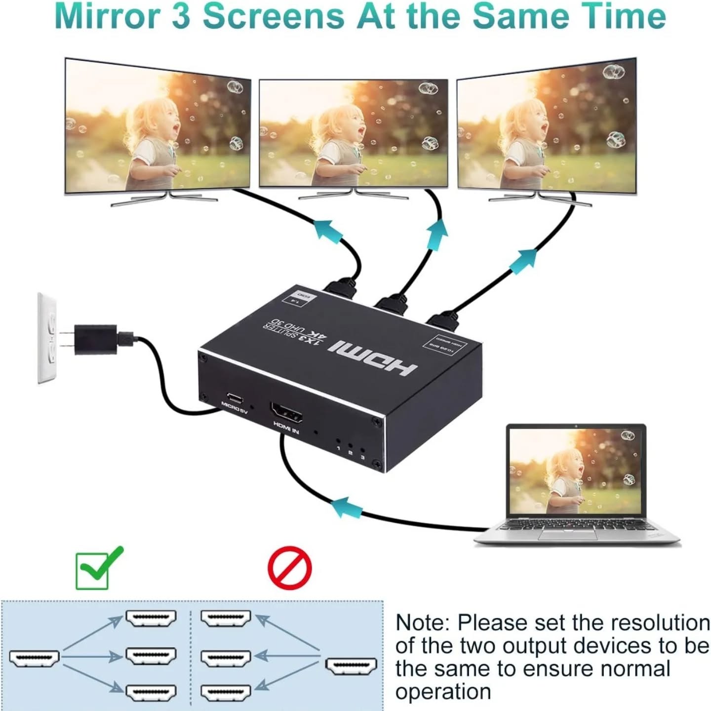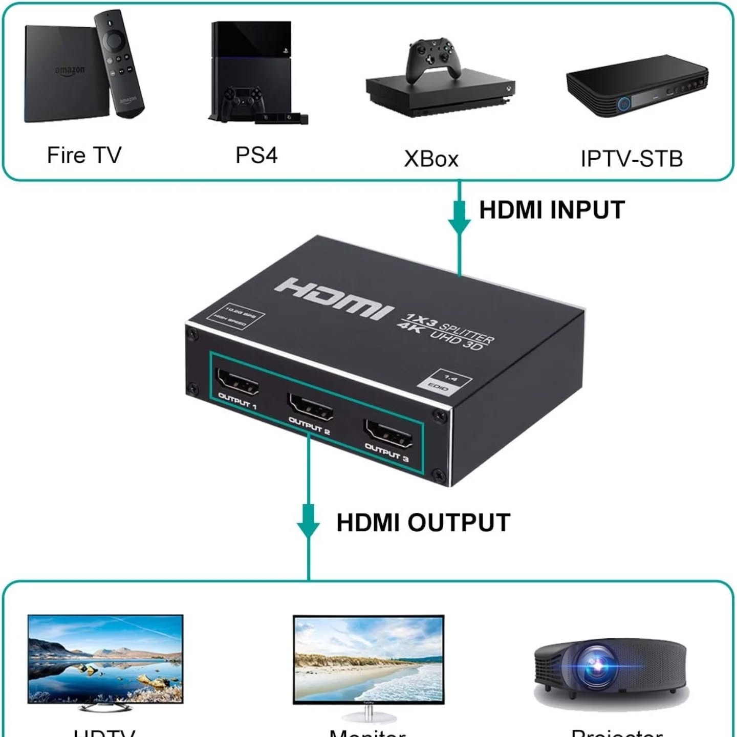 Divisor HDMI 1x3, 1 en 3 salidas HDMI Splitter Audio Video Distribuidor Caja Soporte 3D y 4K x 2K Compatible para HDTV, STB, DVD, PS3, proyector, etc