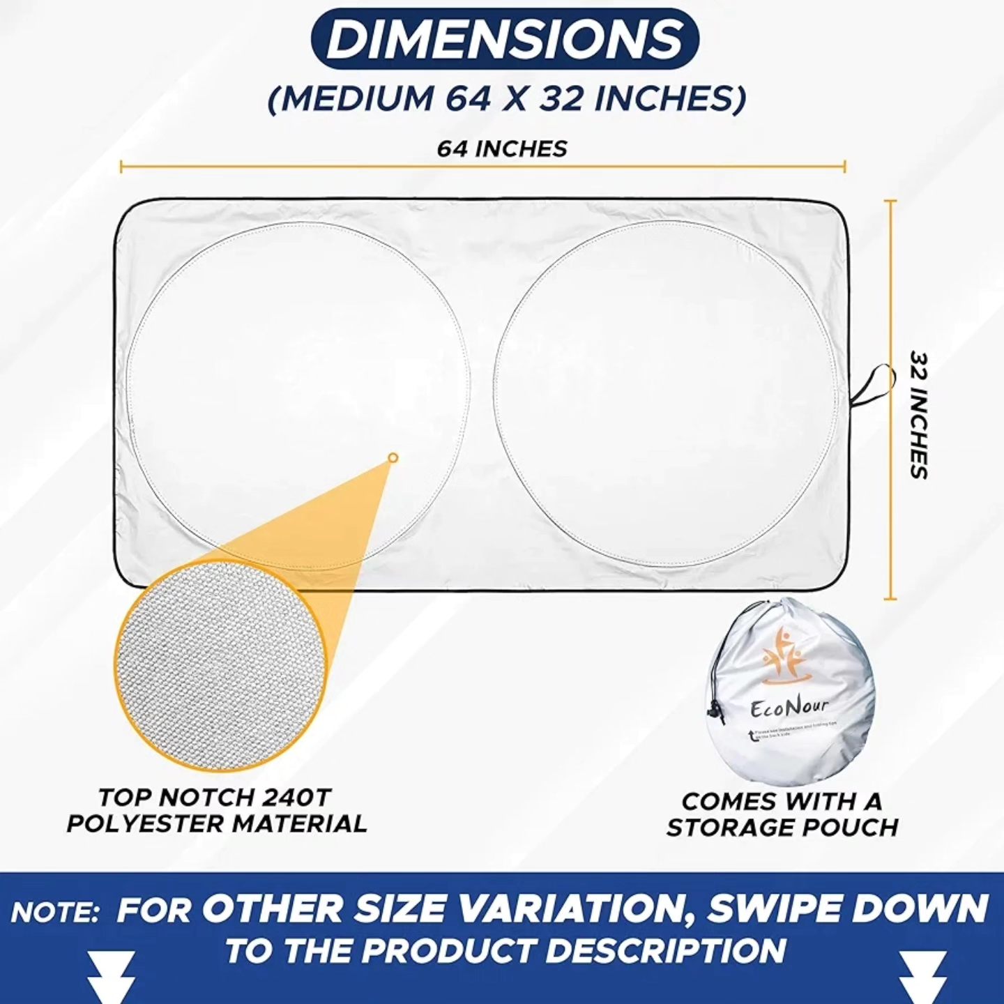 EcoNour - Parasol reflector para parabrisas de automóvil, protección para el interior, para un automóvil fresco, se adapta a sedanes pequeños, mini SUV y hatchbacks, mediano (64 x 32 pulgadas).