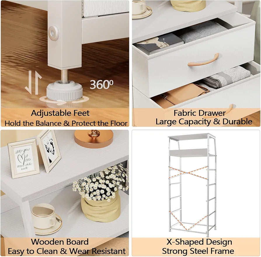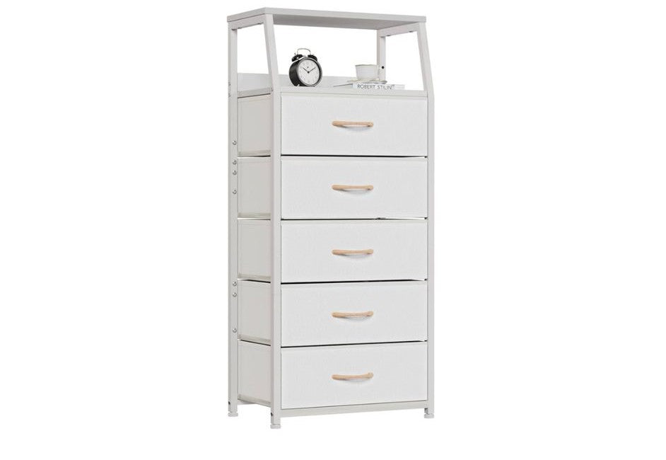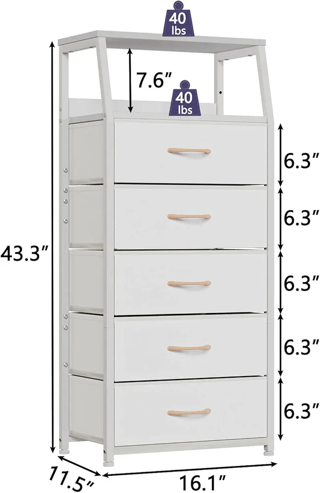 Furnulem Cómoda blanca con 5 cajones, cómoda de tela de torre de almacenamiento vertical para dormitorio, pasillo, entrada, guardería, organizador de armario, mesita de noche, mesita de noche, marco.