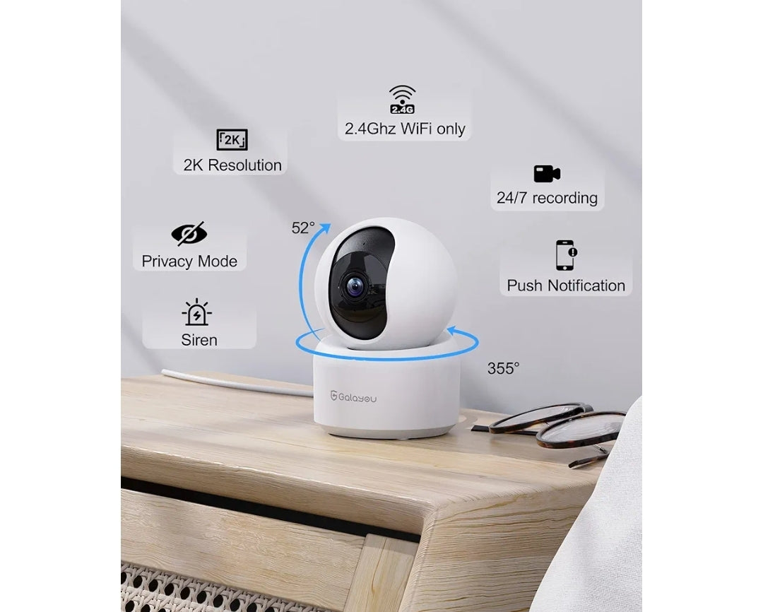 GALAYOU Cámara de seguridad interior 2K, cámara para mascotas, cámara de seguridad WiFi de 360 grados para el hogar, para bebé/anciano/niñera con visión nocturna, sirena, almacenamiento de tarjeta SD