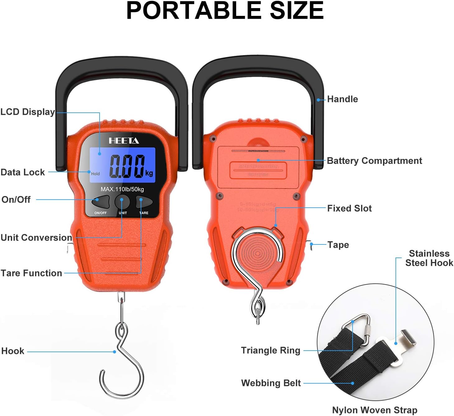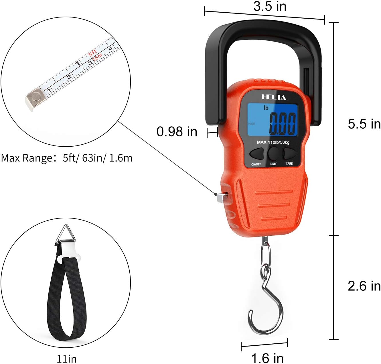 HEETA Báscula de pescado con pantalla LCD retroiluminada, hasta 110 libras/110.2 lbs, báscula digital portátil para colgar peces con gancho y cinta métrica para el hogar, granja, al aire libre, caza.
