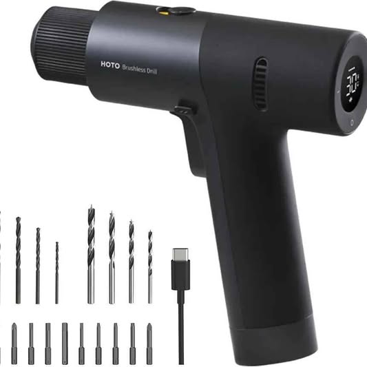HOTO Taladro inalámbrico sin escobillas de 12 V, pantalla LED, 30 engranajes de precisión, 2 modos de trabajo, batería de 2000 mAh, par de 266 In-lbs (30 N·m), portabrocas sin llave de 3/8 pulgadas, 1400 RPM, 10 brocas, 8 brocas.