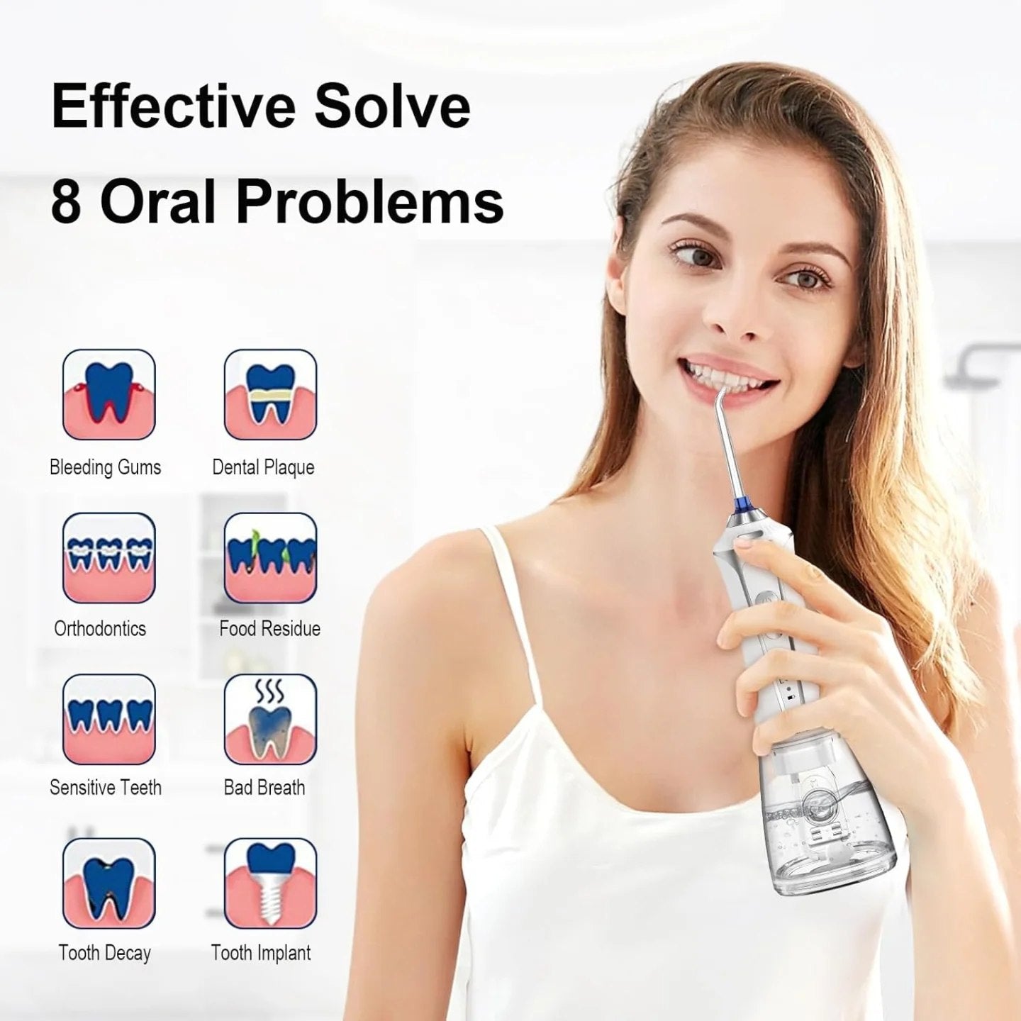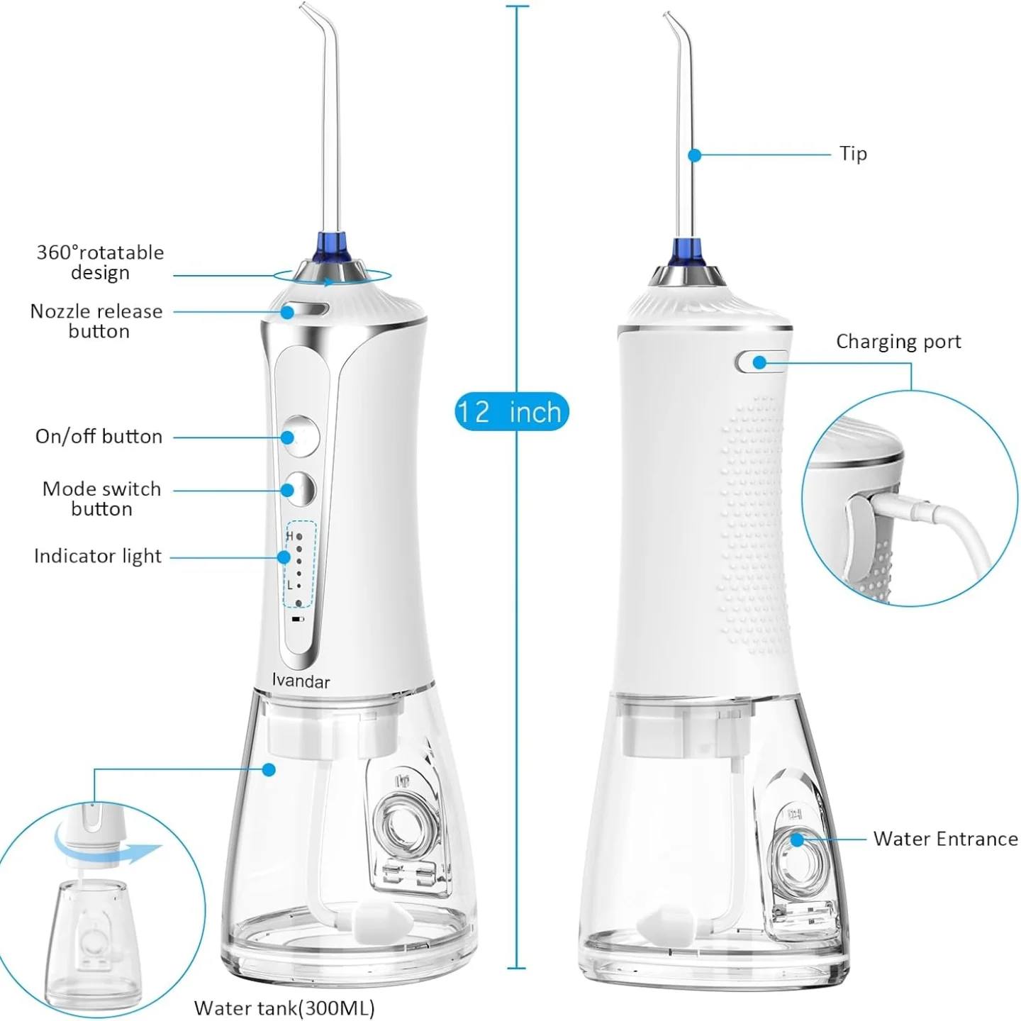 Ivandar Irrigador dental de agua para limpiador de dientes, inalámbrico, portátil y recargable, 5 niveles de presión, 6 puntas de chorro, hogar y viajes, IPX7 impermeable, depósito de 10.1 fl oz.