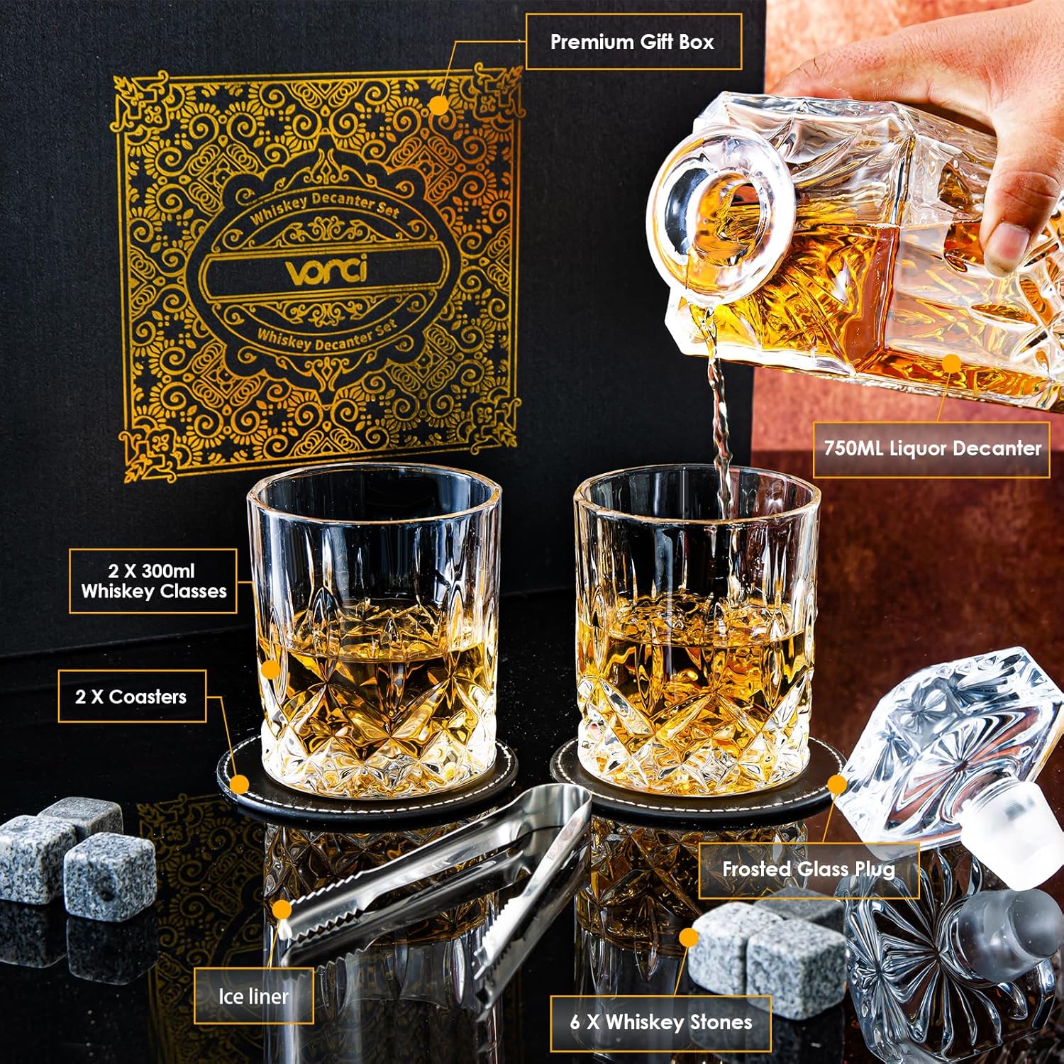 VONCI - Juego de jarra de whisky con 2 vasos, juego de vasos de whisky