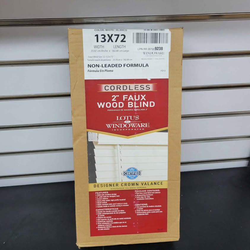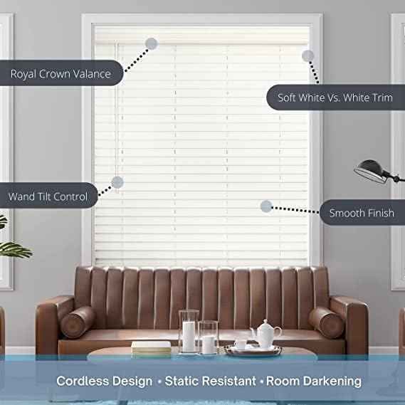 Lotus & Windoware Persiana de madera sintética de 2 pulgadas, sin cables, 13 pulgadas de ancho x 72 pulgadas de largo, suave, blanco.