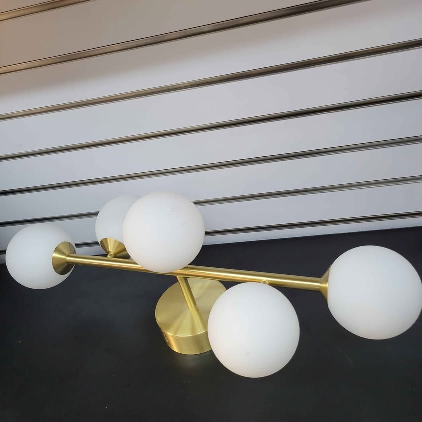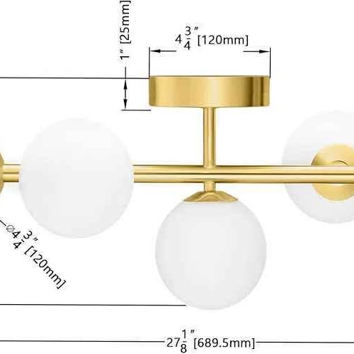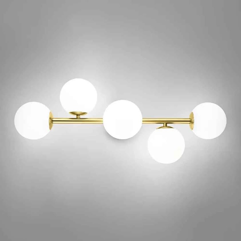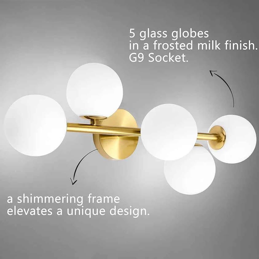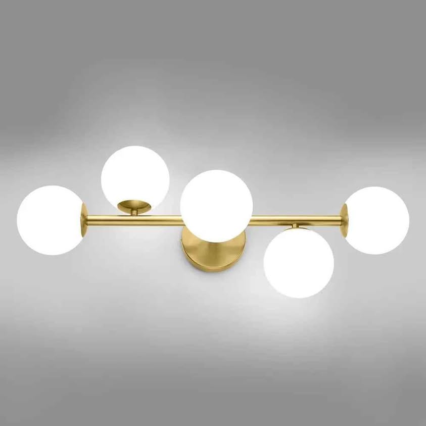 Luces de tocador de baño modernas de mediados de siglo, 5 lámparas de baño de latón dorado, lámpara de techo semiempotrada, lámpara de pared dorada con vidrio de leche esmerilado de globo, base G9.