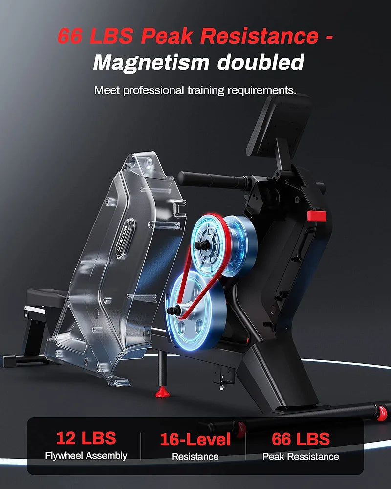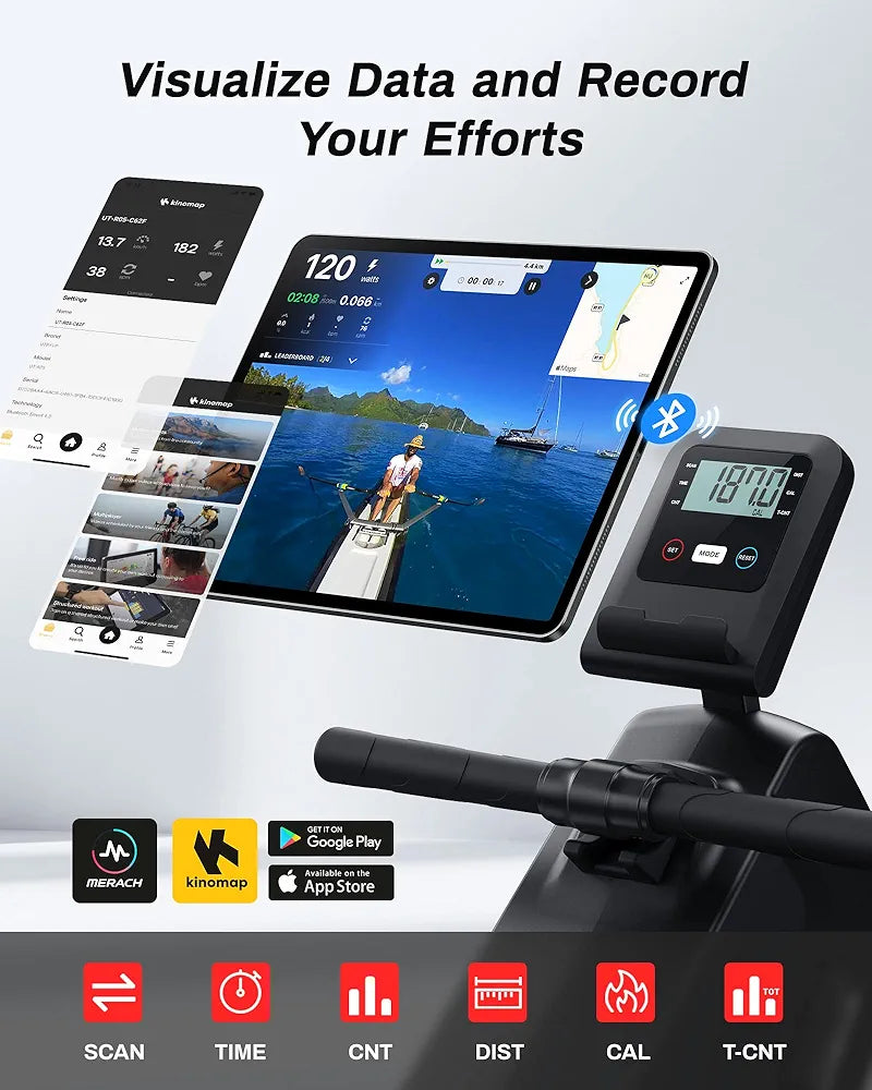 Máquinas de remo magnéticas para el hogar (R05), remo de agua (R10), 16 niveles de resistencia silenciosa, plegable, compacta, capacidad de peso de 350 libras con Bluetooth