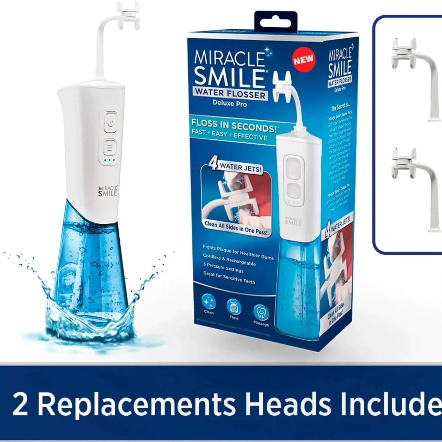 Ontel Miracle Smile - Irrigador dental para la salud de dientes y encías, cabezal único en forma de H y 4 chorros de agua, irrigador de agua inalámbrico con limpieza de 360° y 3 modos de presión, hilo