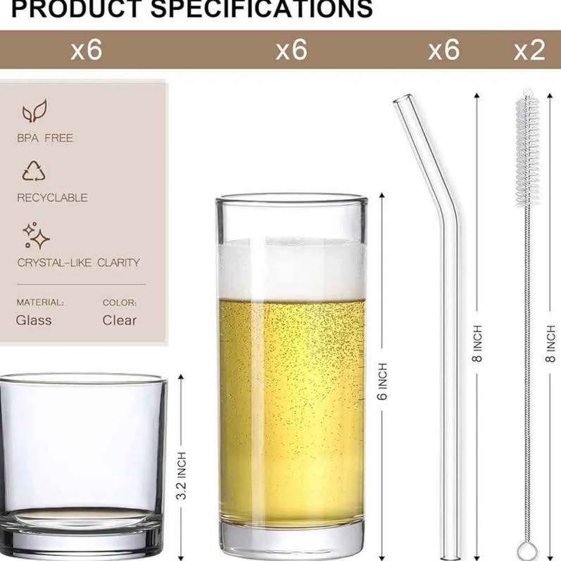 [Paquete de 12] Vasos de vidrio con pajitas de vidrio, vasos de 12 onzas para beber Highball & Rock de 12 onzas, juego de vasos para uso diario, lindo vaso, vasos de cocina para café helado, agua.