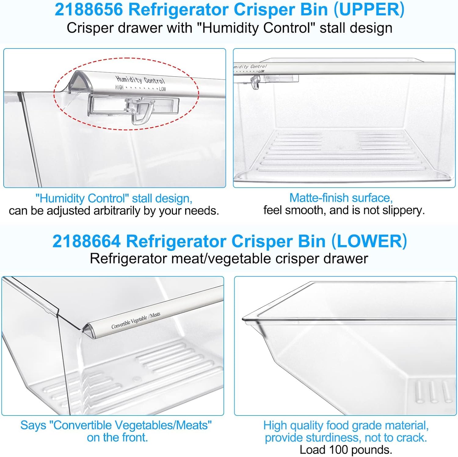 Paquete de 2 cajones/bandejas mejoradas para nevera 2188656 (superior) y 2188664 contenedor para nevera (inferior) compatible con cajones de refrigerador Whirlpool Kenmore con control de humedad, materiales de grado alimenticio.