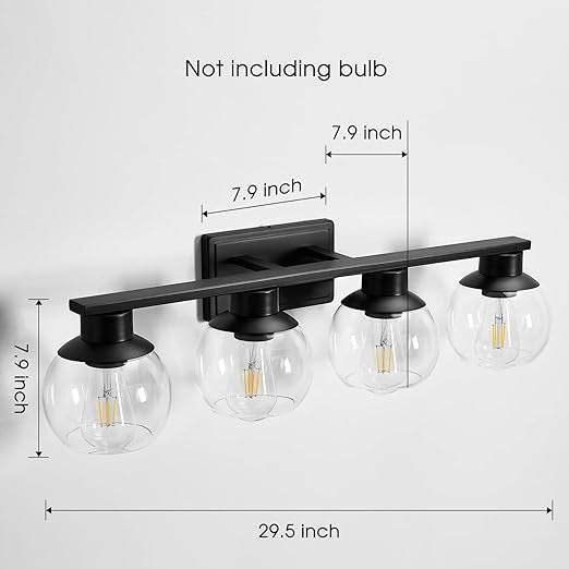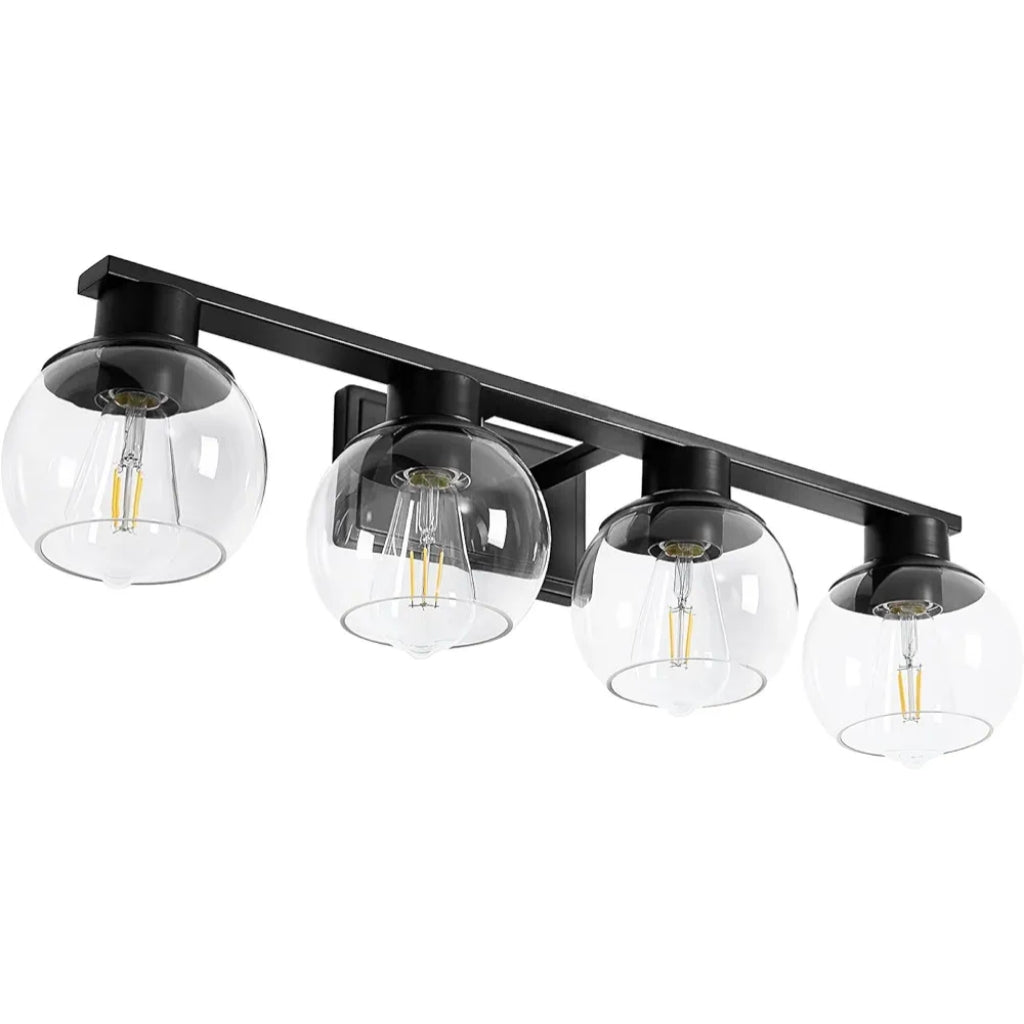 Pazala Lámpara de tocador negra mate para baño, 4 luces, lámpara de pared sobre espejo con pantalla de vidrio transparente, 30 pulgadas.