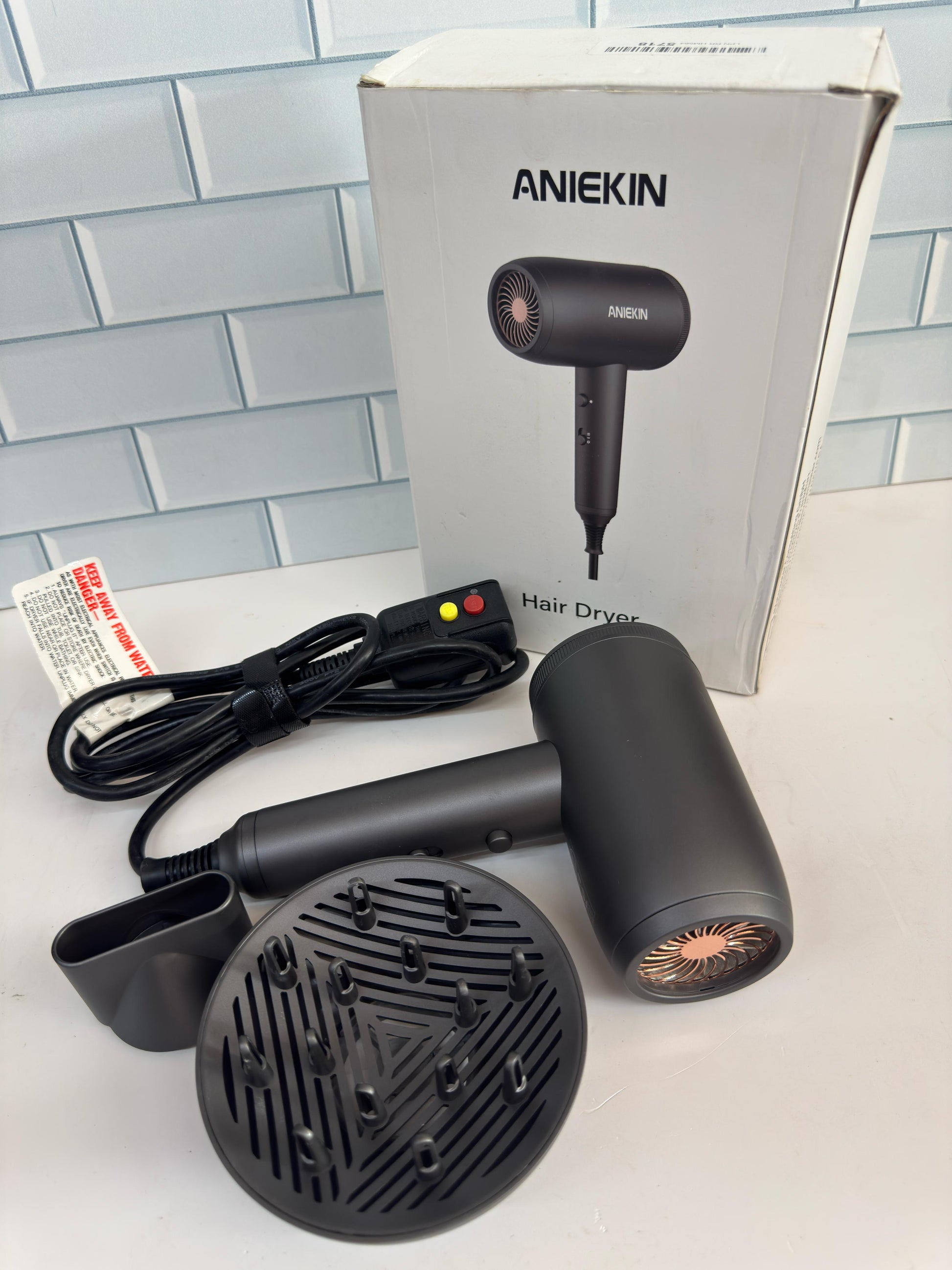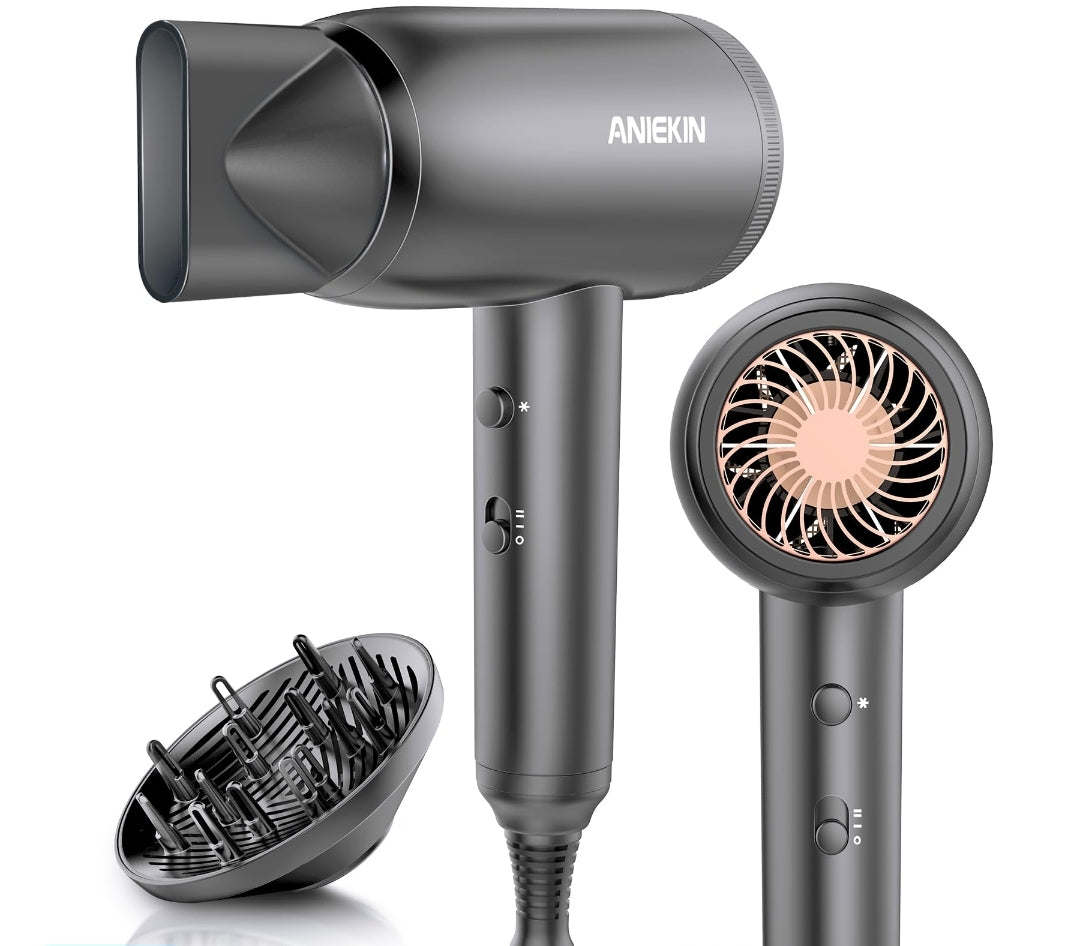 Secador de pelo ANIEKIN, secador iónico profesional con difusor y concentrador para cabello rizado, secador de viaje ligero para mujeres, secado rápido y silencioso - Gris