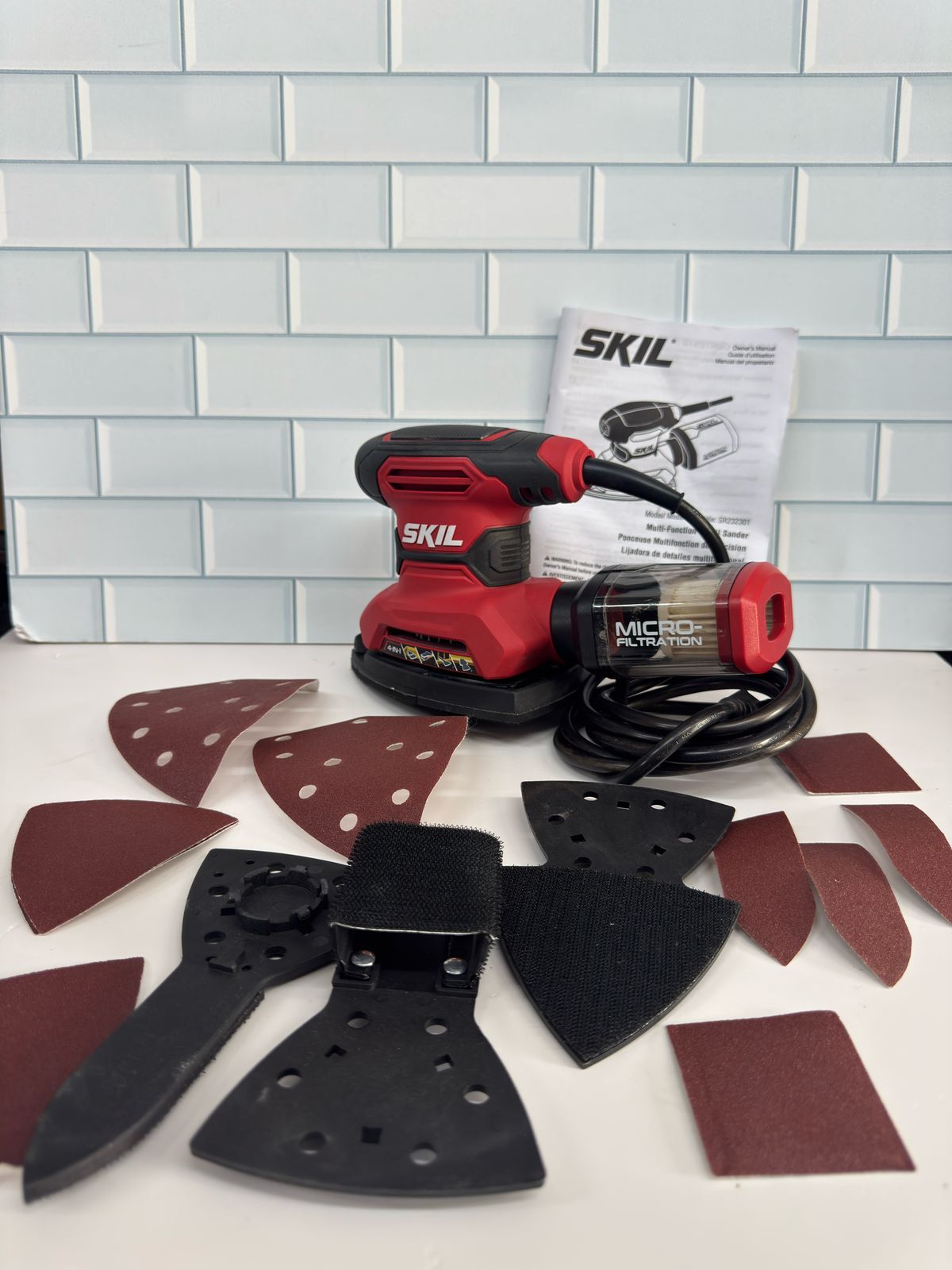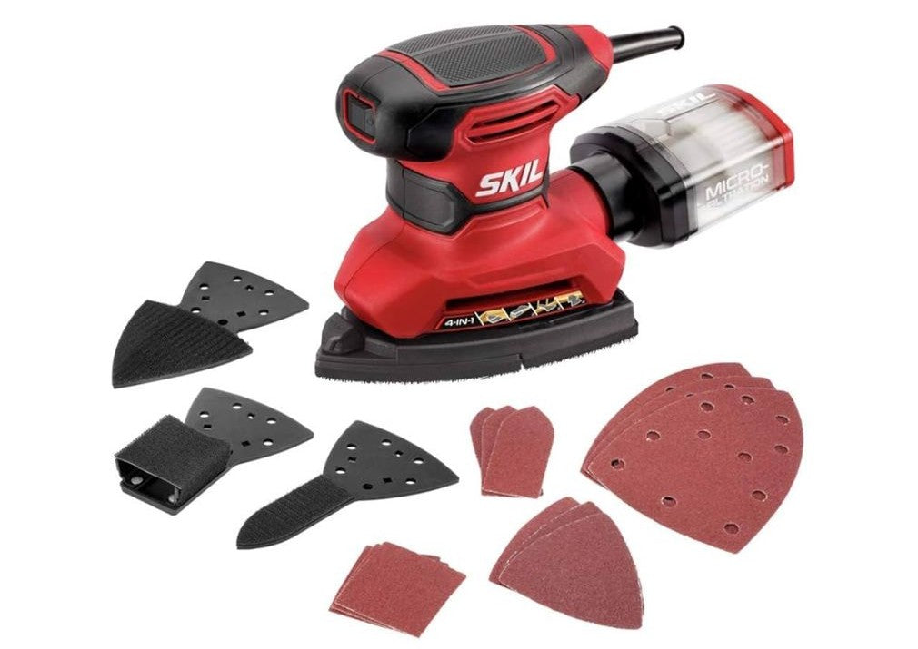 SKIL SR232301 - Lijadora de detalles multifunción con cable con caja antipolvo de microfiltro, 3 accesorios adicionales y 12 hojas de lijado