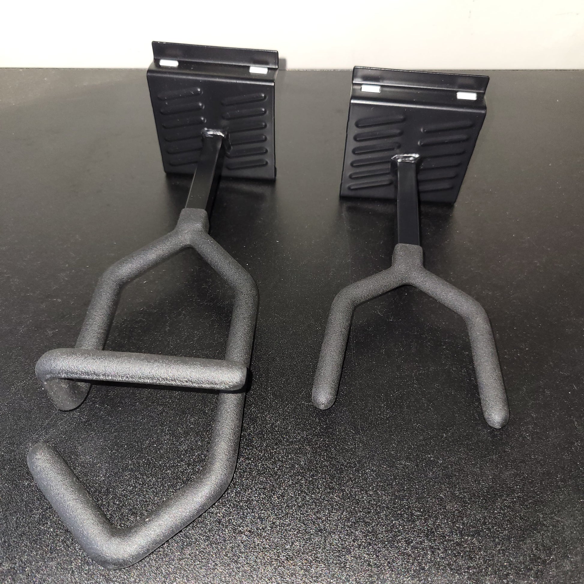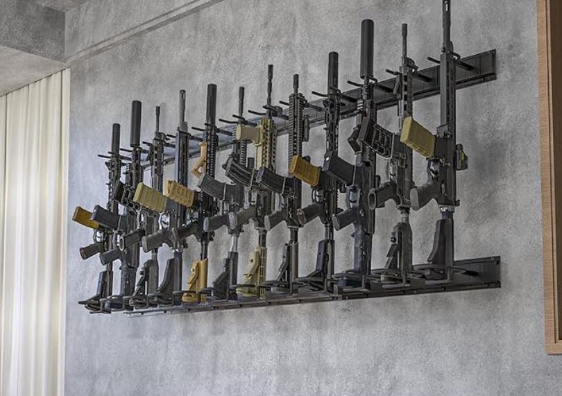 (Solo 2 Soportes o ganchos de pared) ajustable de acero resistente para interiores soporte de rifle, no daña la pintura del arma, adecuado para rifles, escopetas y rifles de francotirador. SE UTILIZA CON SLATWALL (NO INCLUIDO).