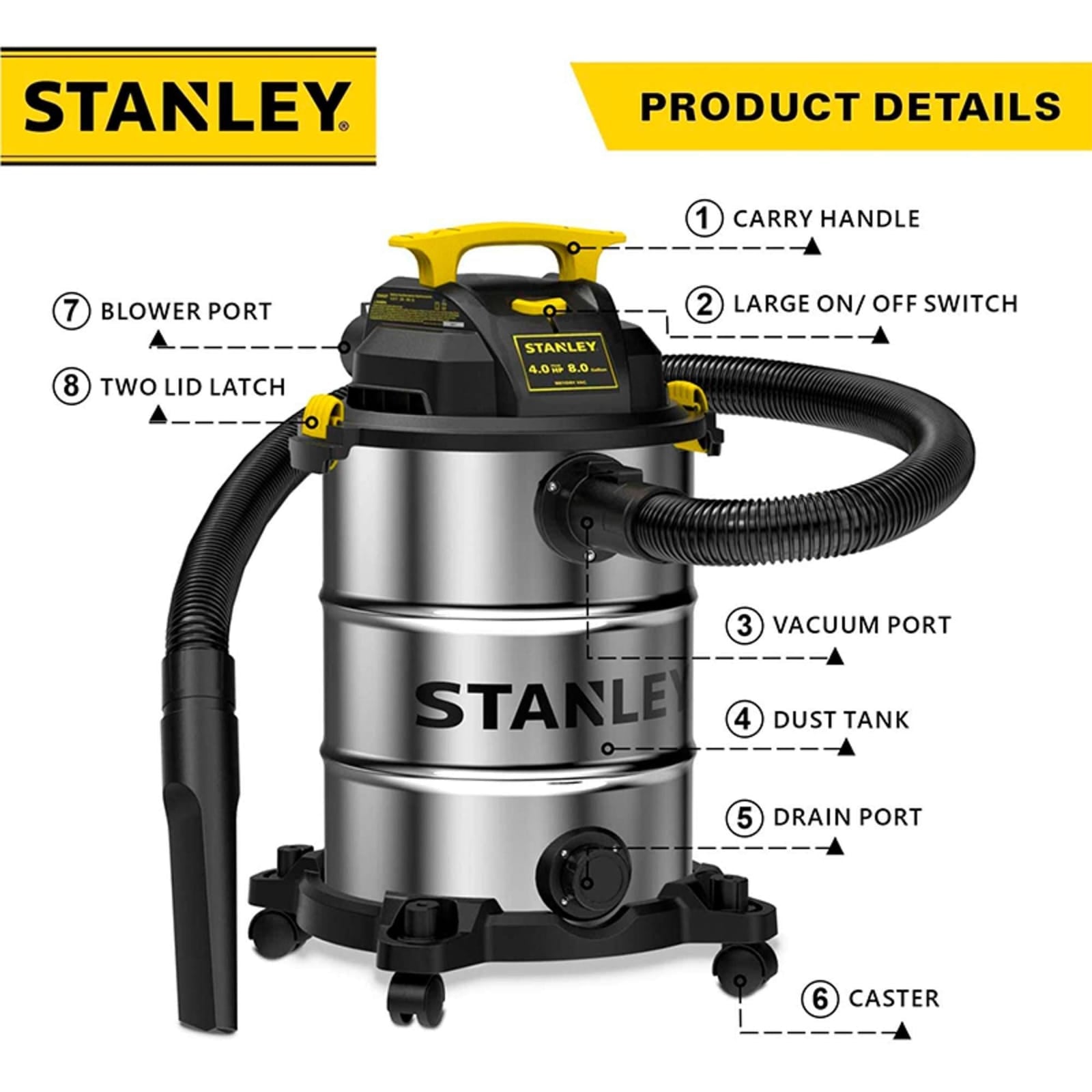 STANLEY Aspiradora en seco y húmedo de 8 galones, 4 HP de acero inoxidable 3 en 1 con soplador, aspiradora multifuncional para el hogar, lugar de trabajo, garaje, sótano. Plus incluimos 3 bolsas filtro gratis
