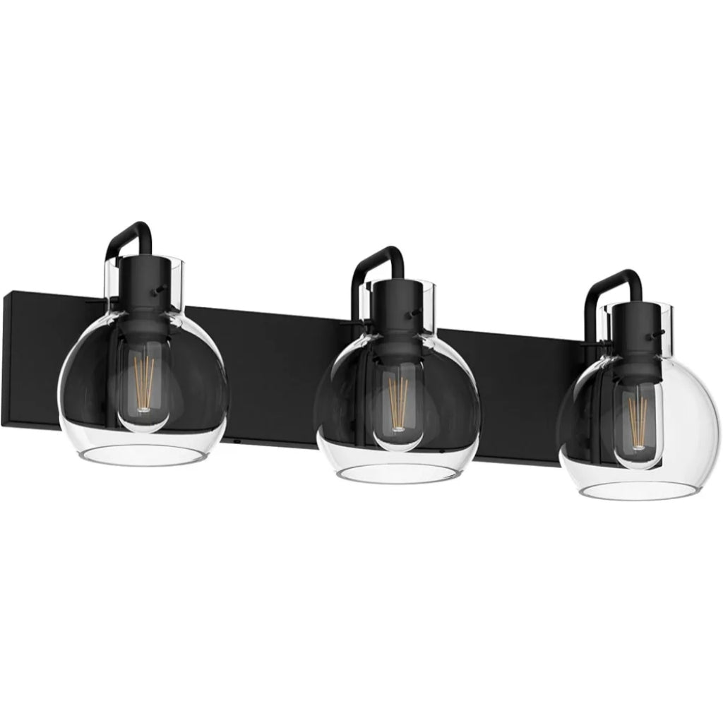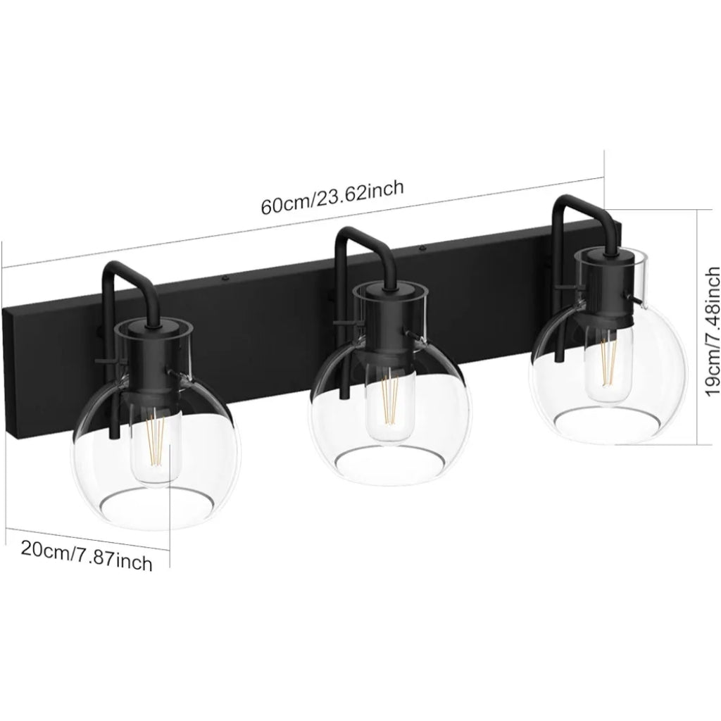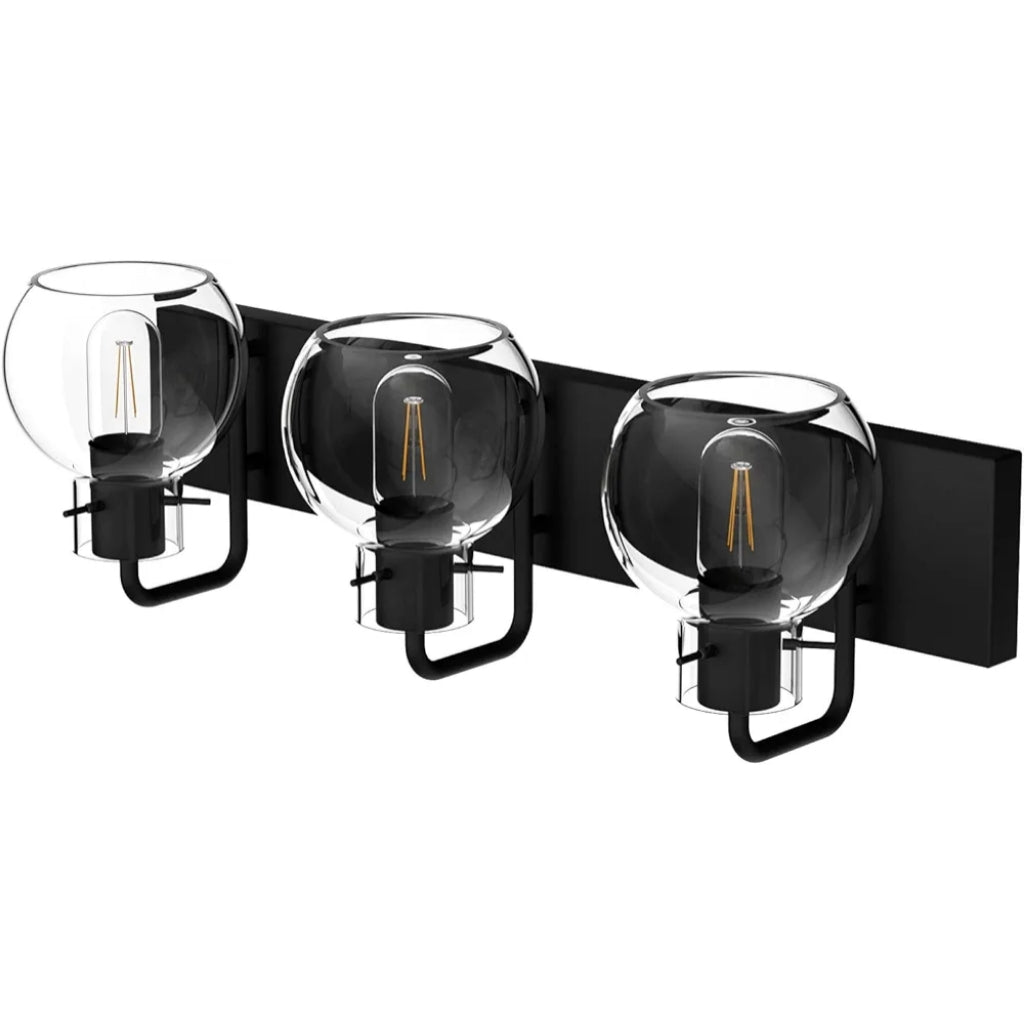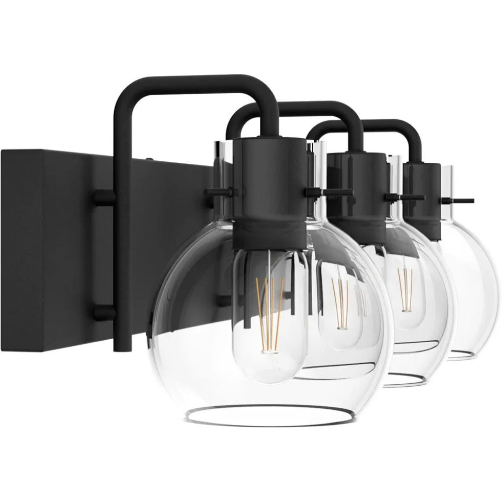 Tipace Lámparas industriales para tocador de baño, 3 luces, acabado negro mate con globo de vidrio transparente, iluminación de baño vintage (sin bombilla).