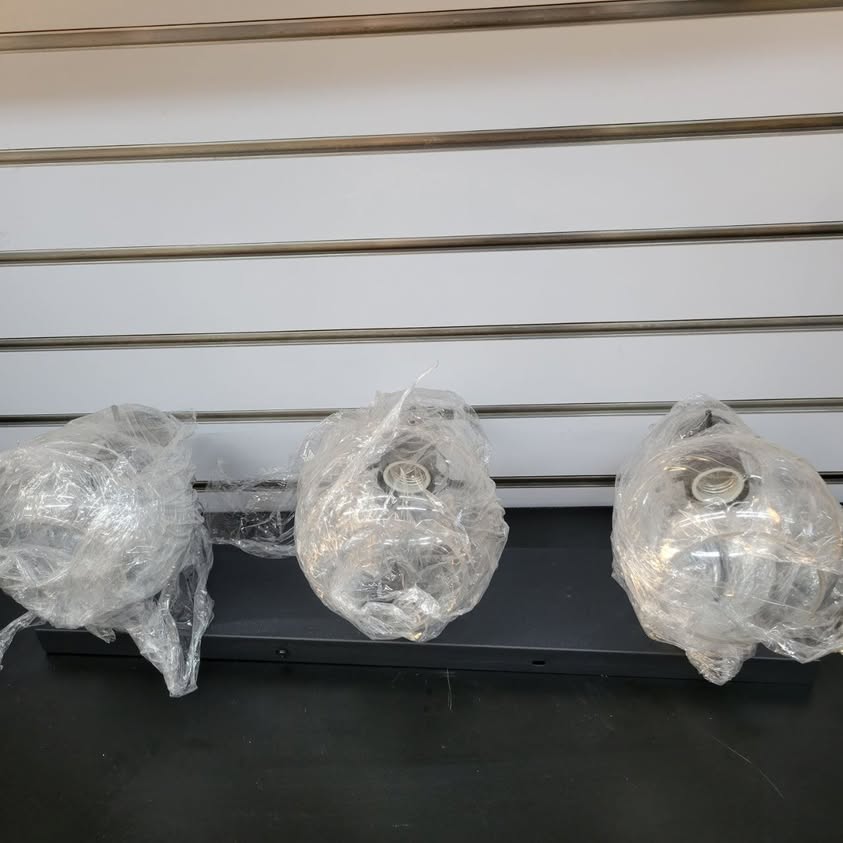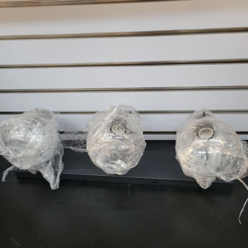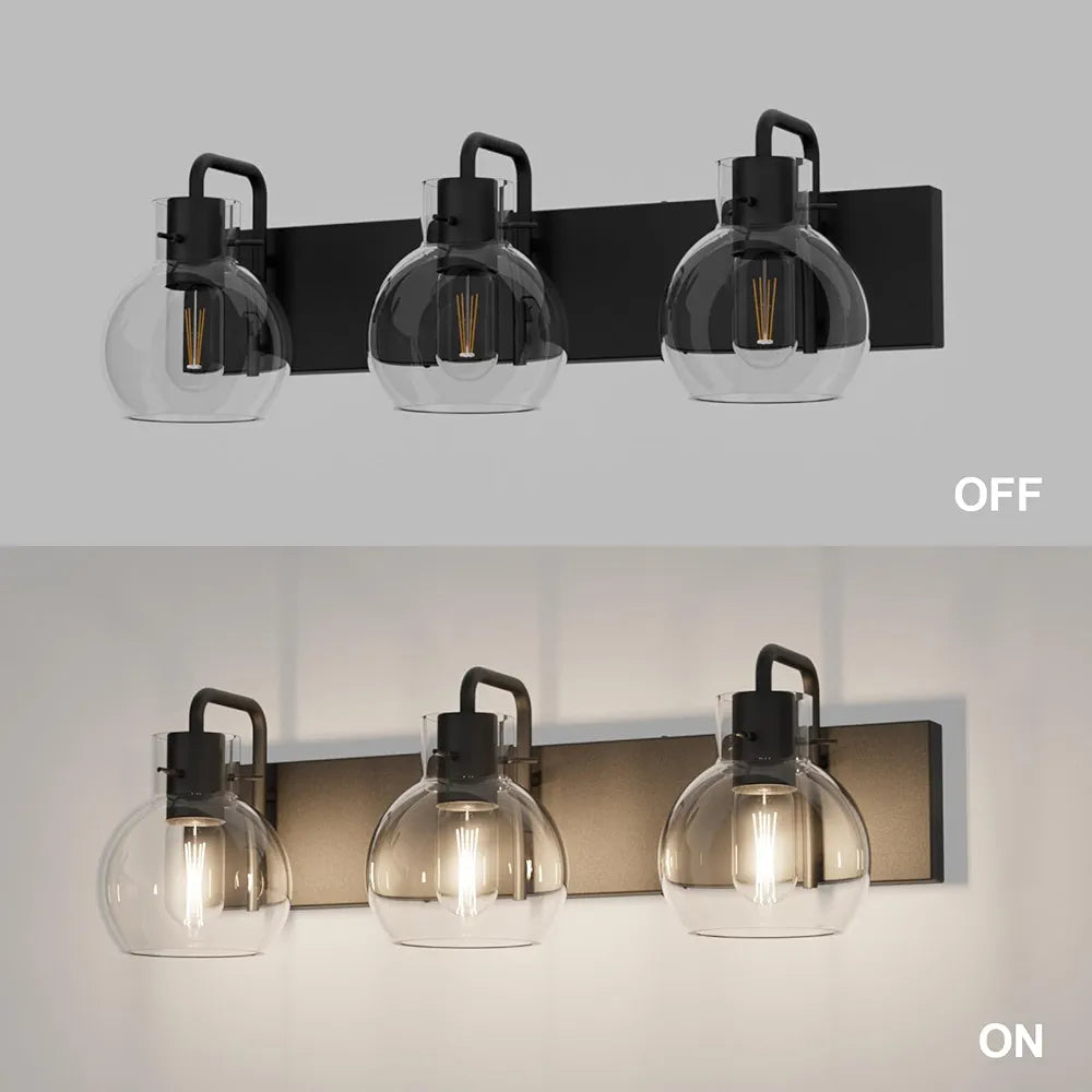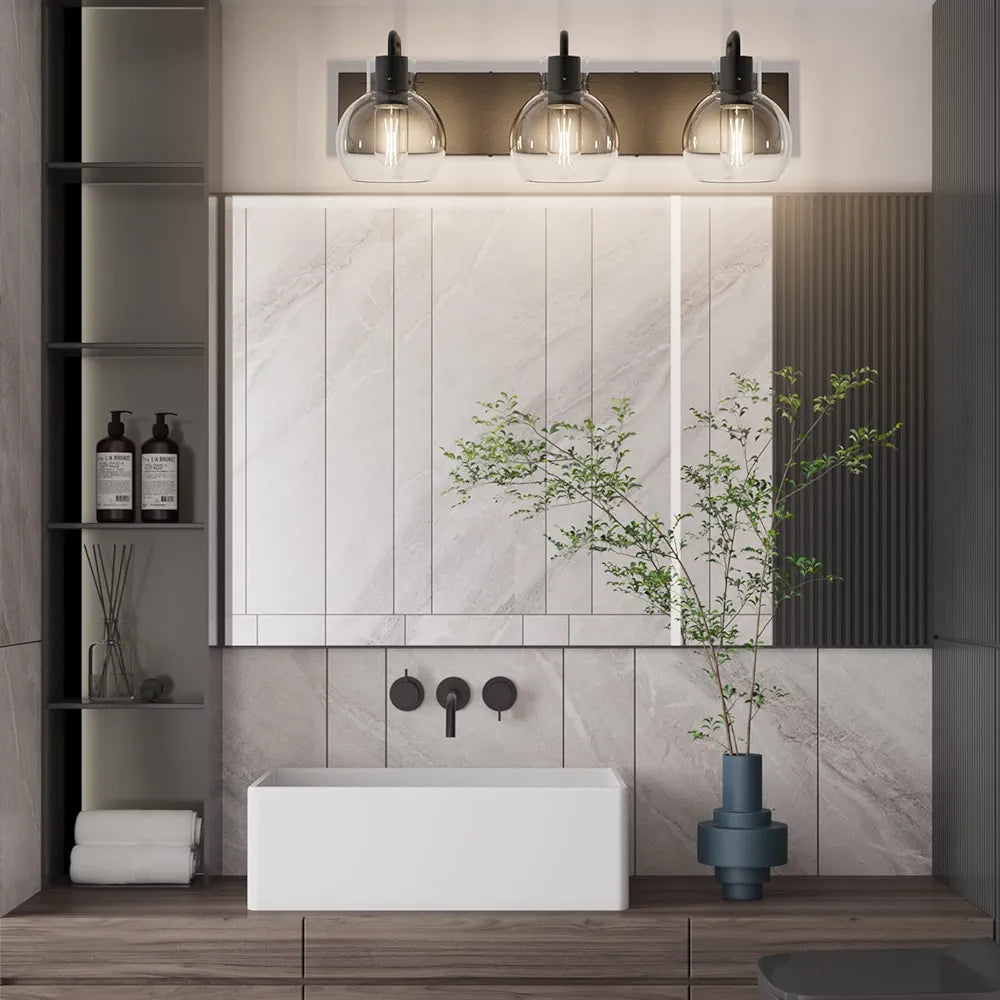 Tipace Lámparas industriales para tocador de baño, 3 luces, acabado negro mate con globo de vidrio transparente, iluminación de baño vintage (sin bombilla).