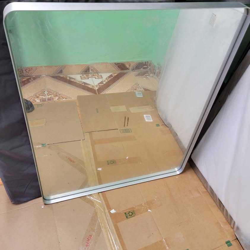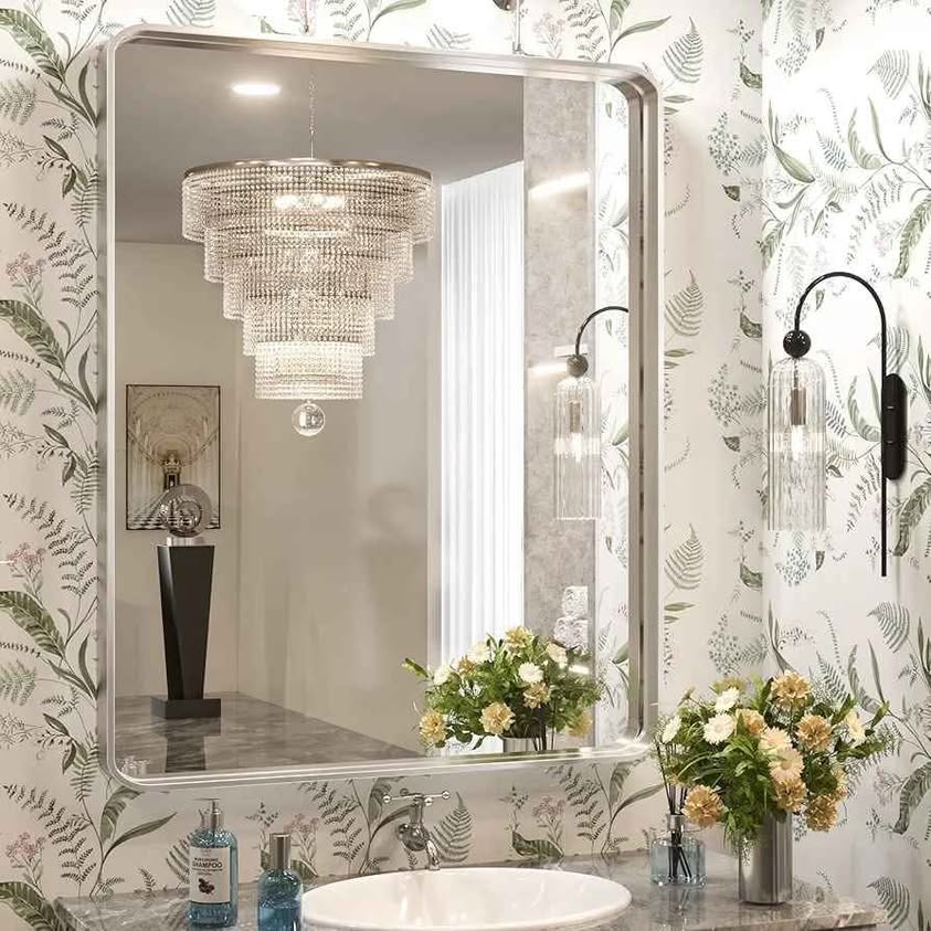 TokeShimi Espejo de baño plateado cepillado de 30 x 36 pulgadas para pared, espejo rectangular de esquina redondeada de metal de latón cepillado, marco de metal, diseño profundo que cuelga horizontal