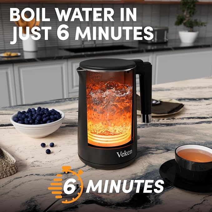 Veken - Hervidor de té eléctrico, interior de acero inoxidable 304 de 1.5 litros, 1500 W, doble pared aislada, caldera de agua caliente con apagado automático y protección contra ebullición para café, té, bebidas (negro)