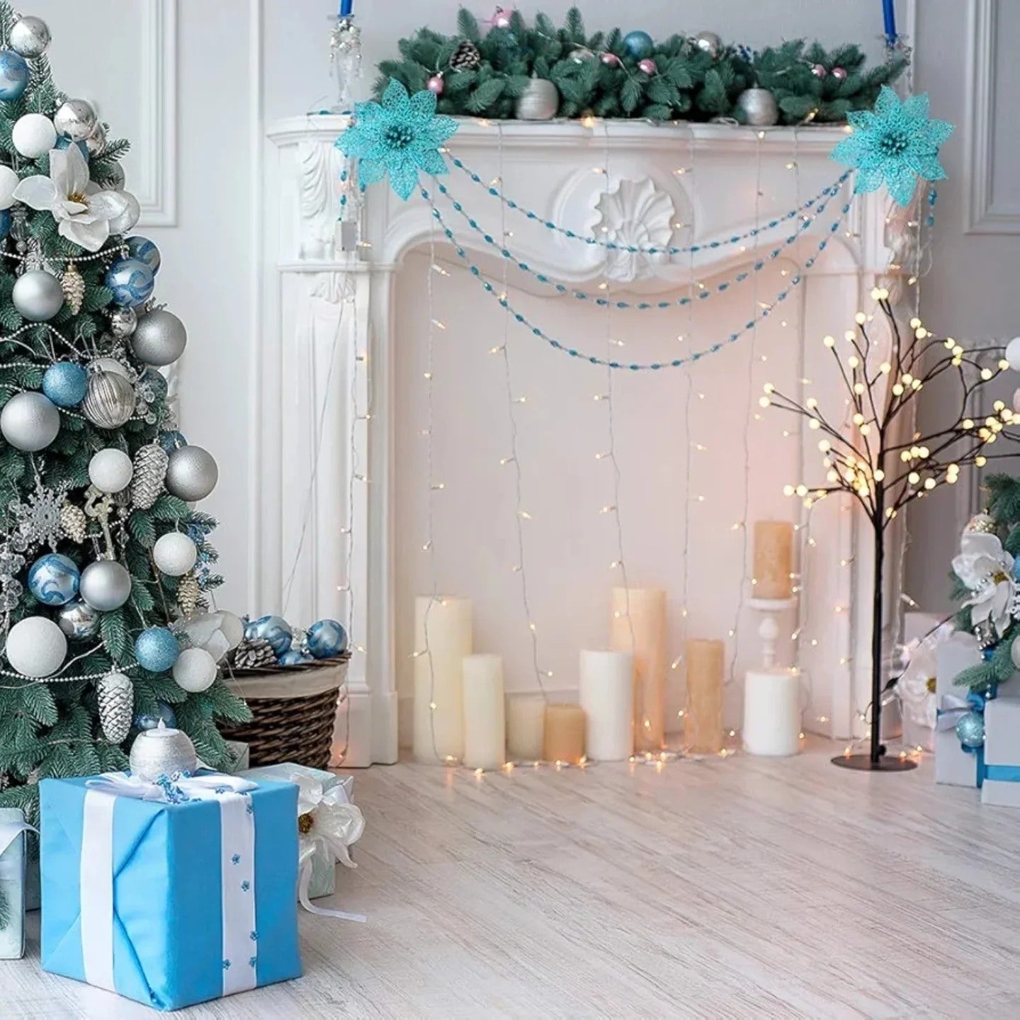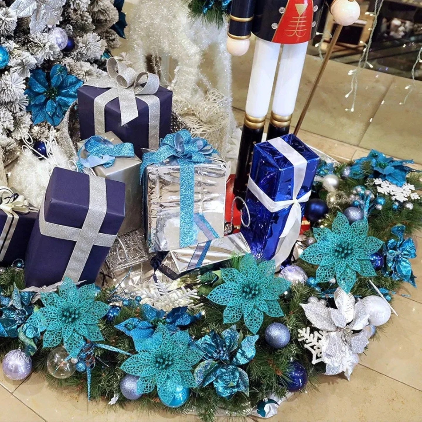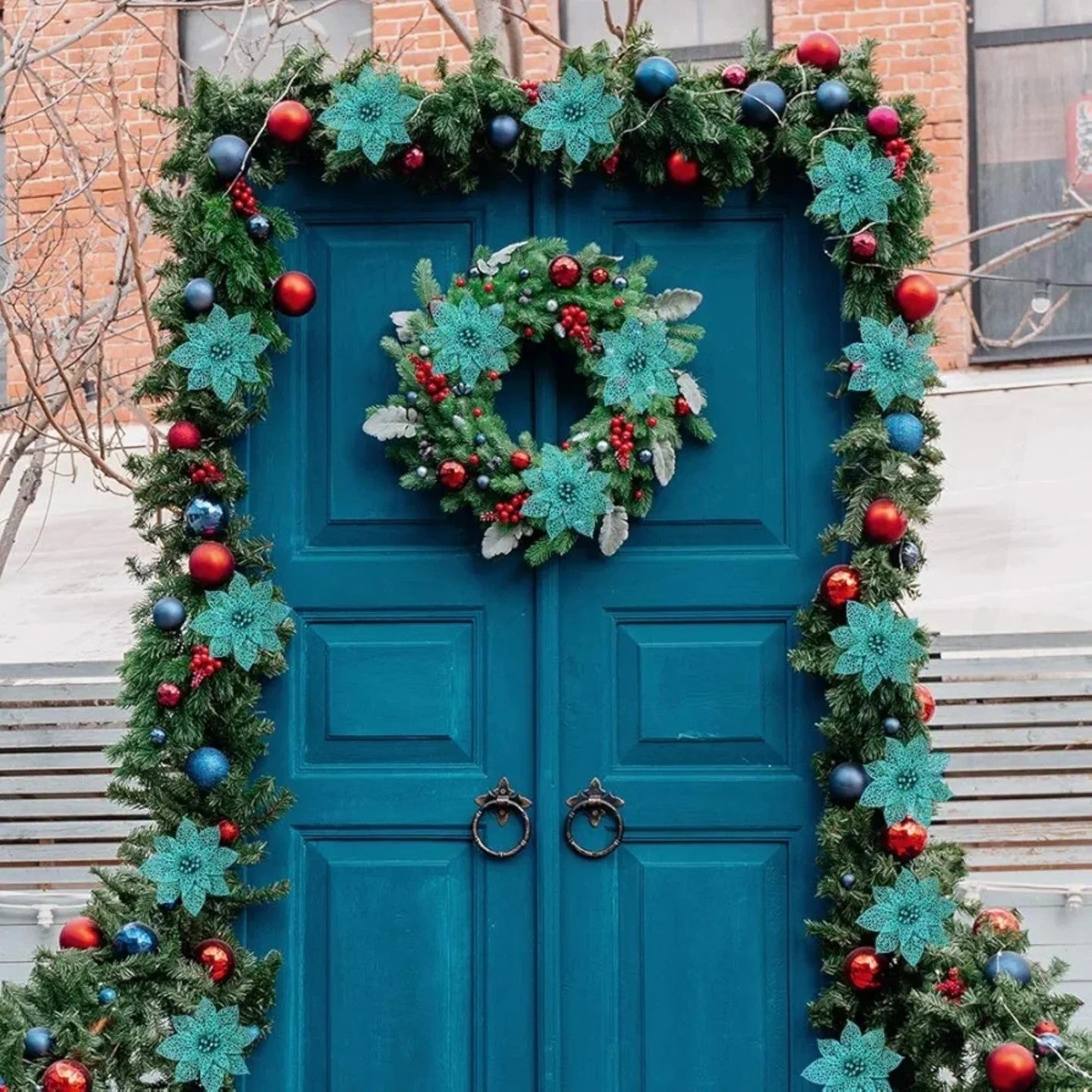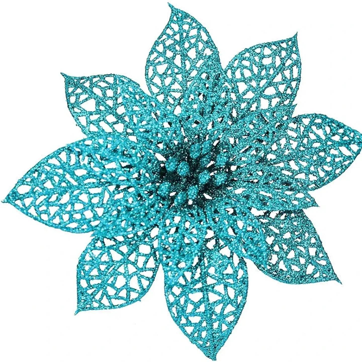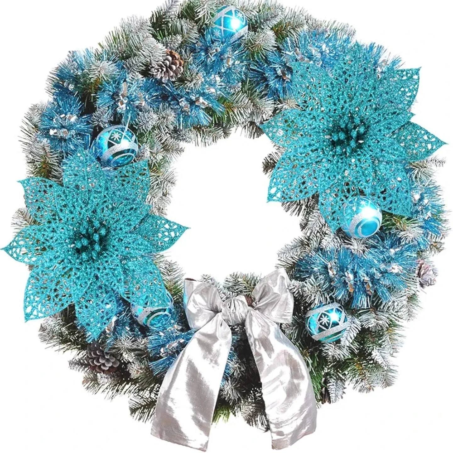 Winlyn Paquete de 24 palillos de flores de Pascua con purpurina verde azulado para árbol de Navidad, adornos de 5.9 pulgadas de ancho para coronas de árbol de Navidad, guirnalda, decoraciones de boda