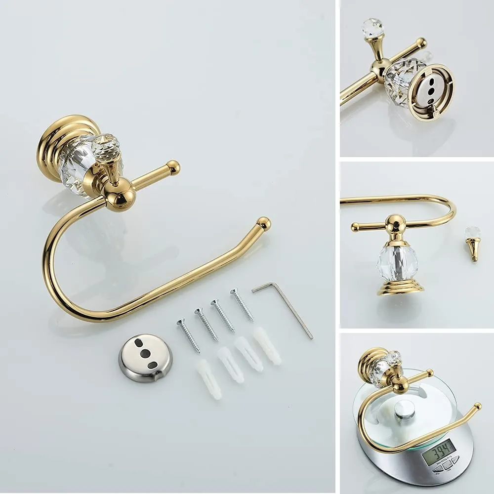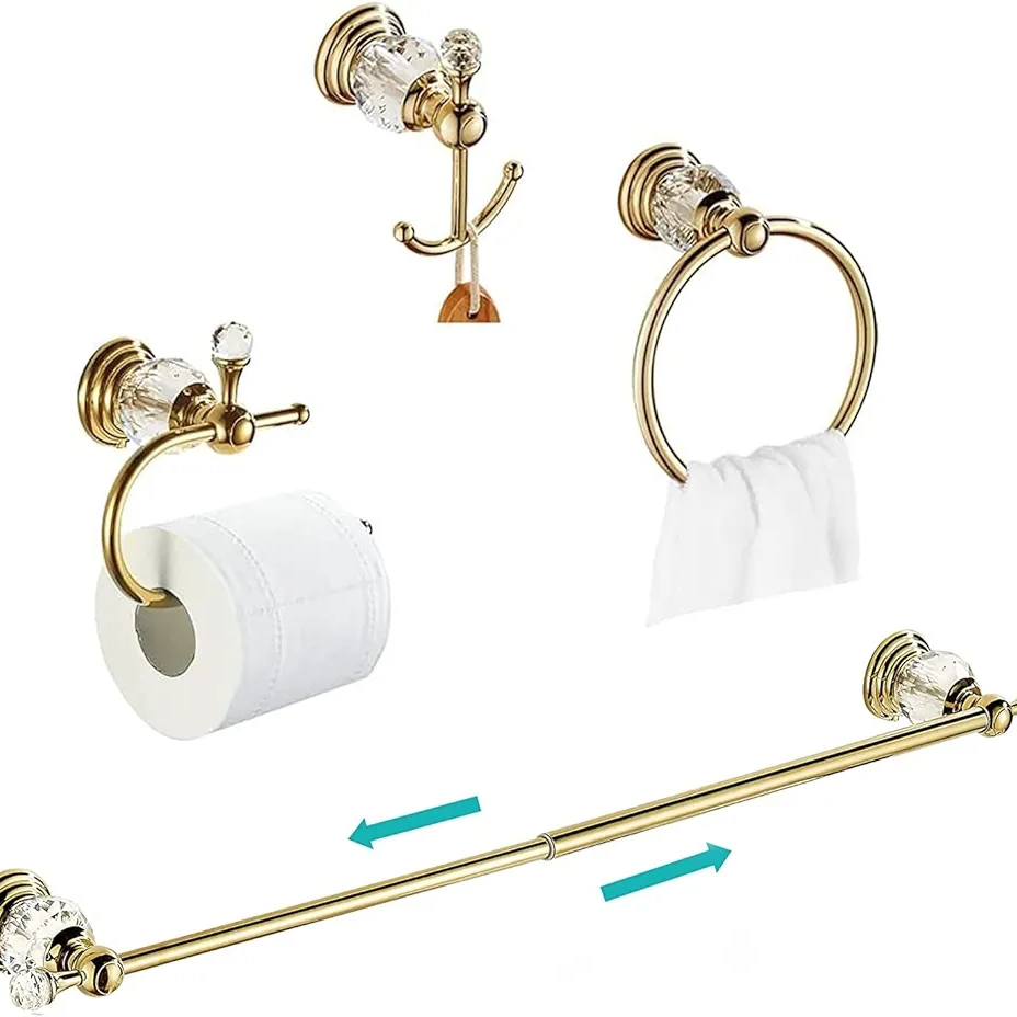 WOLIBEER Accesorios de baño dorados, juego de barra de toalla de cristal de latón, soporte de papel higiénico, toalla, anillo, ganchos para bata, 4 piezas