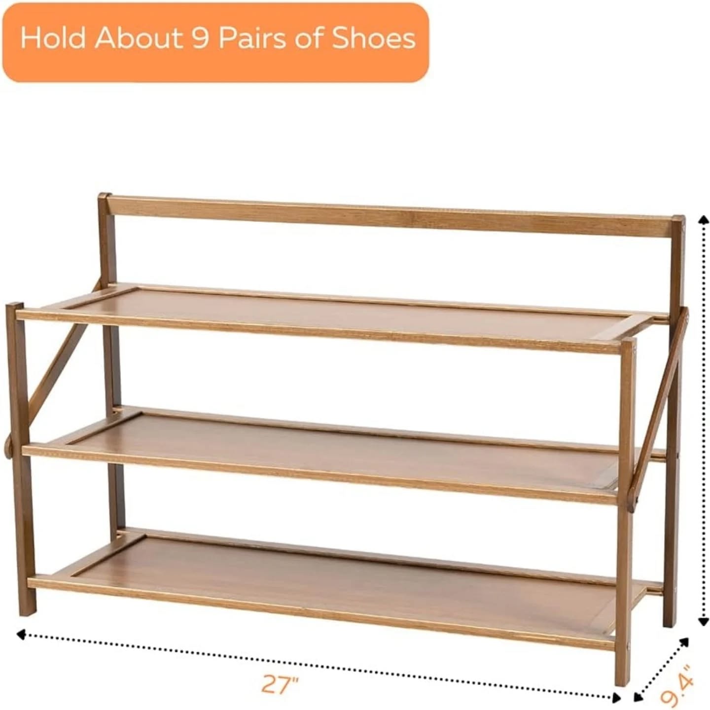 Zapatero pequeño de 3 niveles para armario y entrada, organizador de almacenamiento de zapatos de bambú plegable sin instalación, resistente soporte de zapatos de tres estantes para 9-12 pares, marrón 27 x 18 x 9 pulgadas.